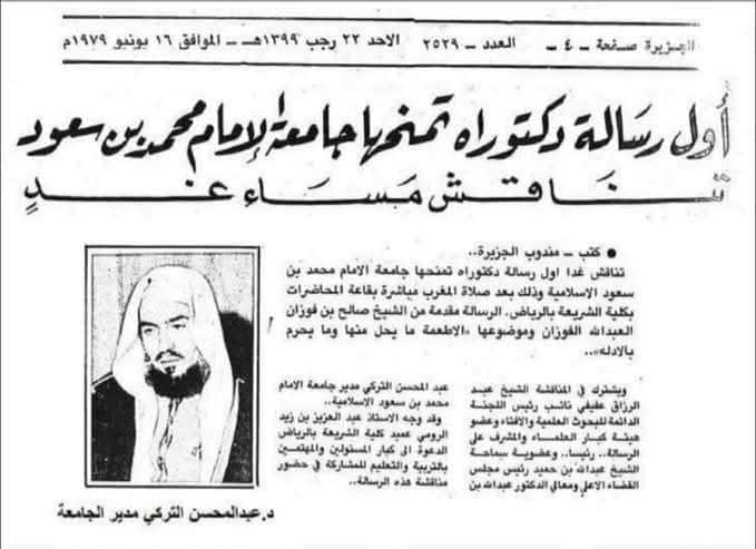دكتوراه في جامعة الإمام محمد بن سعود سنة 1979 بعنوان: «الأطعمة ما يحل منها وما يحرم بالأدلة»!