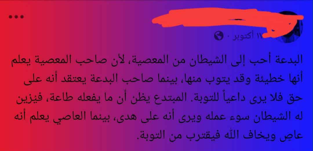القول بأن البدعة أشد من المعصية ليس رأيا علميا يقال في دروس الفقه، بل هو باب فُتح لاستحلال الكبائر باسم الغيرة على الدين.