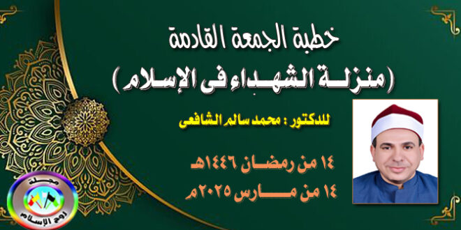 خطبة بعنوان ( منزلة الشهداء فى الإسلام) لفضيلة الدكتور محمد سالم الشافعى لتحميل الخطبة اضغط على الرابط أدناه “ manzelaalsohada