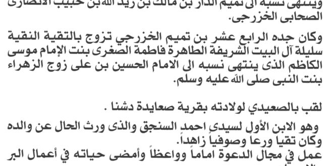 ضريحه : بصعايدة دشنا بمركز دشنا التابع لمحافظة قنا نسبه رضى الله عنه : هو العارف بالله سيدى محمد الصعيدى بن سيدى احمد السنجق بن محمد بن احمد بن عبد الله بن شاهين وينتهى نسبه الى تميم الدار بن مالك بن زيد الله بن حبيب الأنصارى الصحابى الخزرجى. وكان …