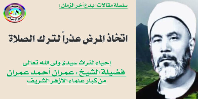 المقال الحادى عشر من سلسلة مقالات (بدع آخر الزمان) إحياء لتراث سيدى ولى الله تعالى فضيلة الشيخ / عمران أحمد عمران من كبار علماء الازهر الشريف ومن مثالبهم (اذا مرض أحدهم ترك الصلاة رأسا حتي يبرأ)، وبعد ذلك قضاها أو لم يقضها، وقد سبق لك ما ورد عن ابن عباس …