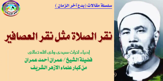 المقال الرابع عشر من سلسلة مقالات (بدع آخر الزمان) إحياء لتراث سيدى ولى الله تعالى فضيلة الشيخ / عمران أحمد عمران من كبار علماء الازهر الشريف ومن بدعهم (نقرهم الصلاة نقراً) لا يتمون حركاتها ولا سكناتها، وذلك مبطل لعملها، ففي البخارى عن أبى وائل عن حذيفة أنه رأى رجلا لا …