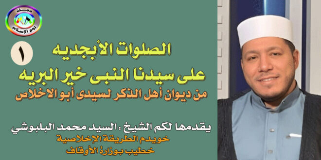 من ديوان أهل الذكر لسيدي برهان الدين أبو الإخلاص رضي الله عنه يقدمها لكم : الشيخ السيد محمد البلبوشي خويدم الطريقة الإخلاصية – خطيب بوزارة الأوقاف الألف اللَّهُمَّ صَلِّ وَسَلِّمْ عَلَى سَيِّدِنَا مُحَمَّدٍ أَلِفِ الأَحَدِيَّةِ الَّتِى لَاغَايَةَ لَهَا وَلَا ابْتِدَاءَ ، وُصَلِّ وَسَلِّمْ عَلَى سَيِّدِنَا مُحَمَّدٍ أَوَّلِ الأَنْوَارِ الإِلَهِيَّةِ الَّذِى …