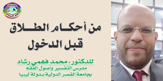 بقلم الدكتور : محمد فهمي رشاد مدرس التفسير وأصول الفقه بجامعة القصر الدولية بدولة ليبيا الطلاق قبل الدخول هو: الطلاق الذي يقع بعد عقد الزواج (كتب الكتاب)، وقبل أن يدخل بها الزوج، أو يخلو بها خلوة شرعية. ويترتب على الطلاق قبل الدخول والخلوة الشرعية ما يأتي: 1- يقع الطلاق بائناً …