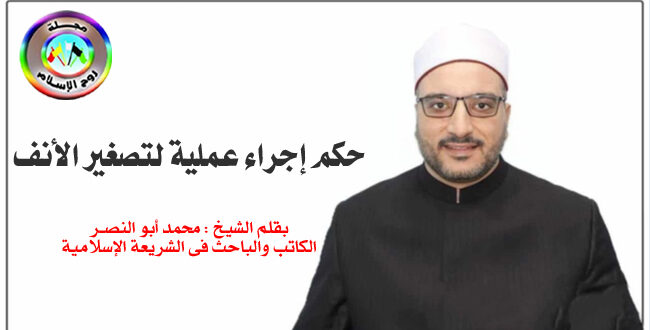 بقلم الشيخ : محمد أبو النصر الكاتب والباحث فى الشريعة الإسلامية حكم إجراء عملية لتصغير الأنف. ● الحمد لله الذي أحسن خلق الإنسان، وجعل له في كل شيء حكمة، وأسبغ عليه نعمه ظاهرة وباطنة. والصلاة والسلام على رسول الله، الذي بعثه الله رحمة للعالمين. أما بعد: فإن من المسائل التي …